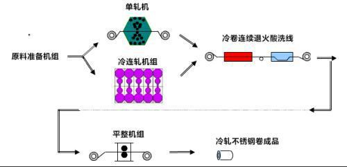 不銹鋼冷軋,多采用熱軋厚度在3.0-5.5mm厚度的不銹鋼熱軋產(chǎn)品,經(jīng)過(guò)冷軋?jiān)O(shè)備的壓延加工之后,生產(chǎn)成不銹鋼冷軋產(chǎn)品。當(dāng)前不銹鋼冷軋主要生產(chǎn)工藝為兩類(lèi):不銹鋼單機(jī)架冷軋、不銹鋼多機(jī)架冷軋。具體生產(chǎn)流程如下圖: